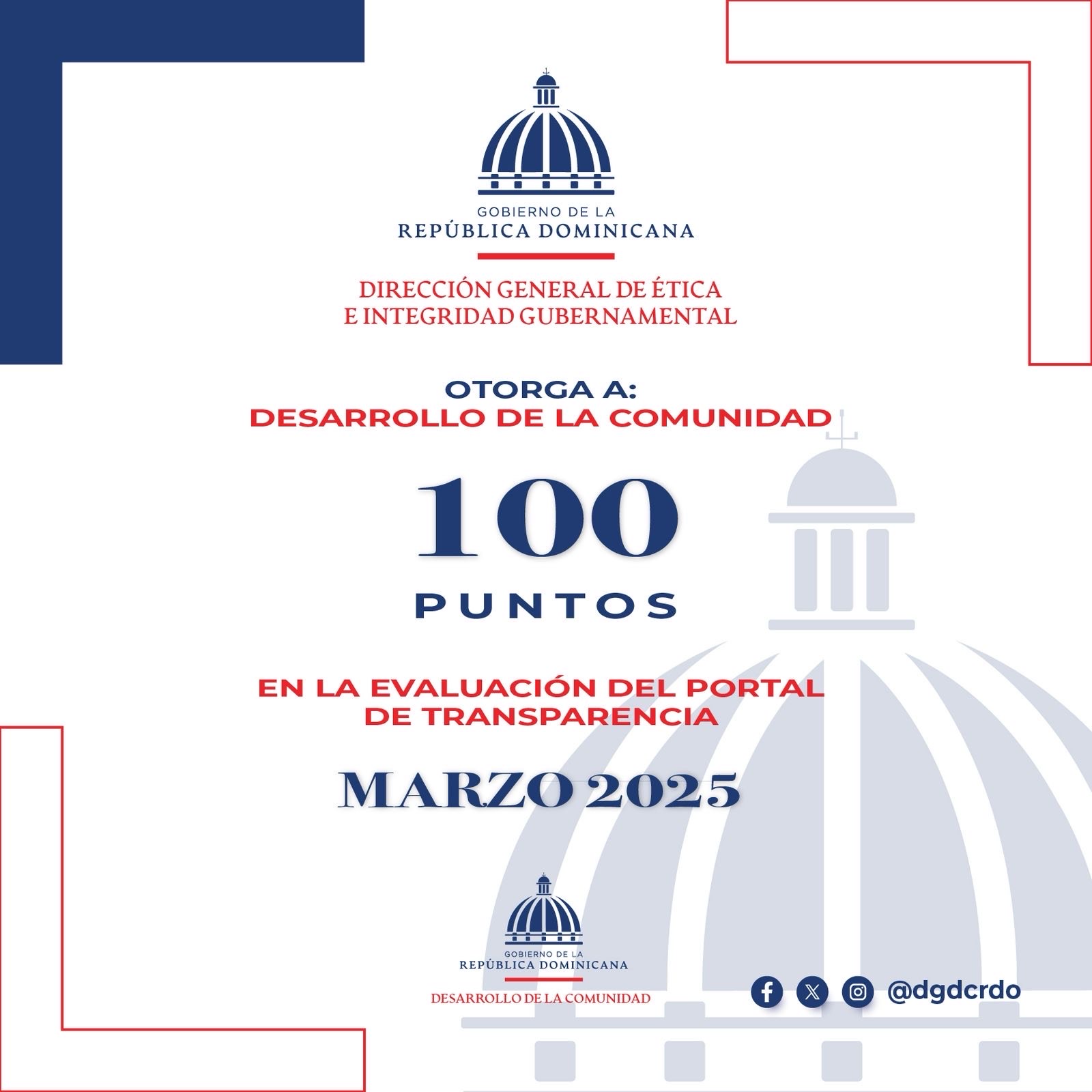 Santo Domingo, RD. – La Dirección General de Ética e Integridad Gubernamental (DIGEIG) otorgó la calificación de 100 puntos a la Dirección General de Desarrollo de la Comunidad (DGDC), cuyo titular es el doctor Modesto Guzmán, esto tras concluir con la más reciente evaluación de los portales web de transparencia de las instituciones públicas correspondiente al mes de marzo 2025.